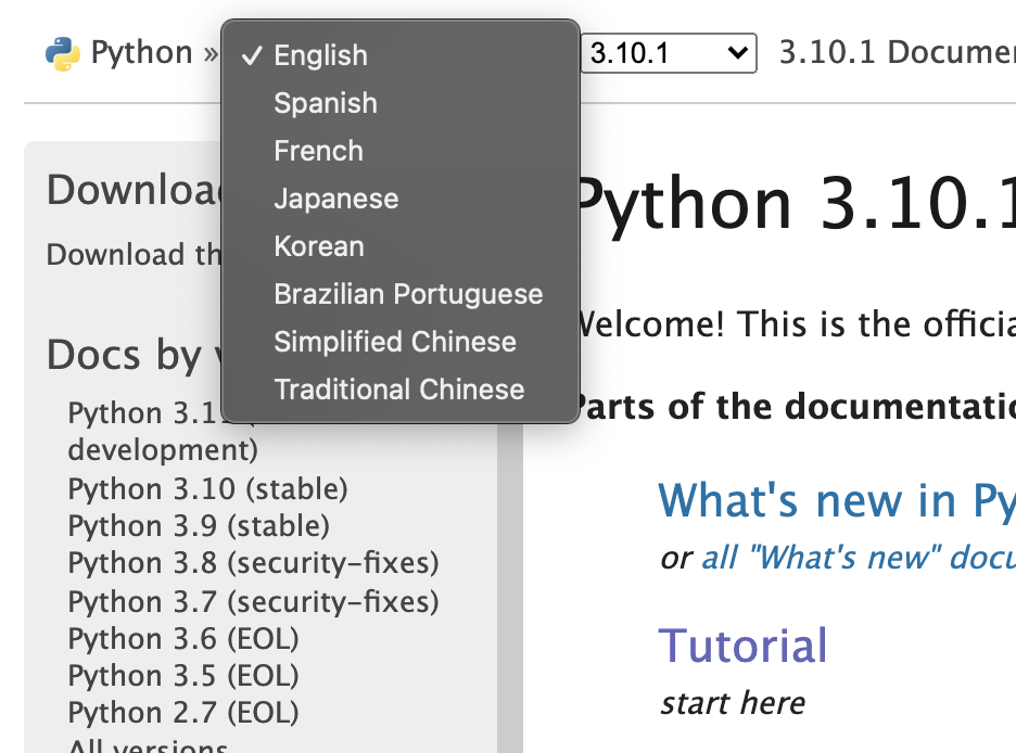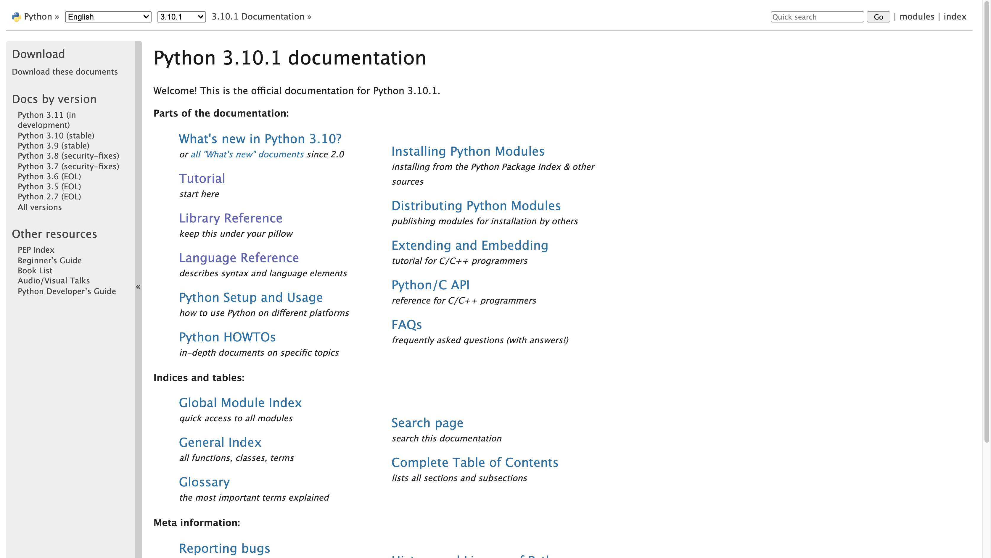 Python 3.10.1 documentation Welcome! This is the official documentation for Python 3.10.1. Parts of the documentation: What's new in Python 3.10? or all "What's new" documents since 2.0 Tutorial start here Library Reference keep this under your pillow Lang