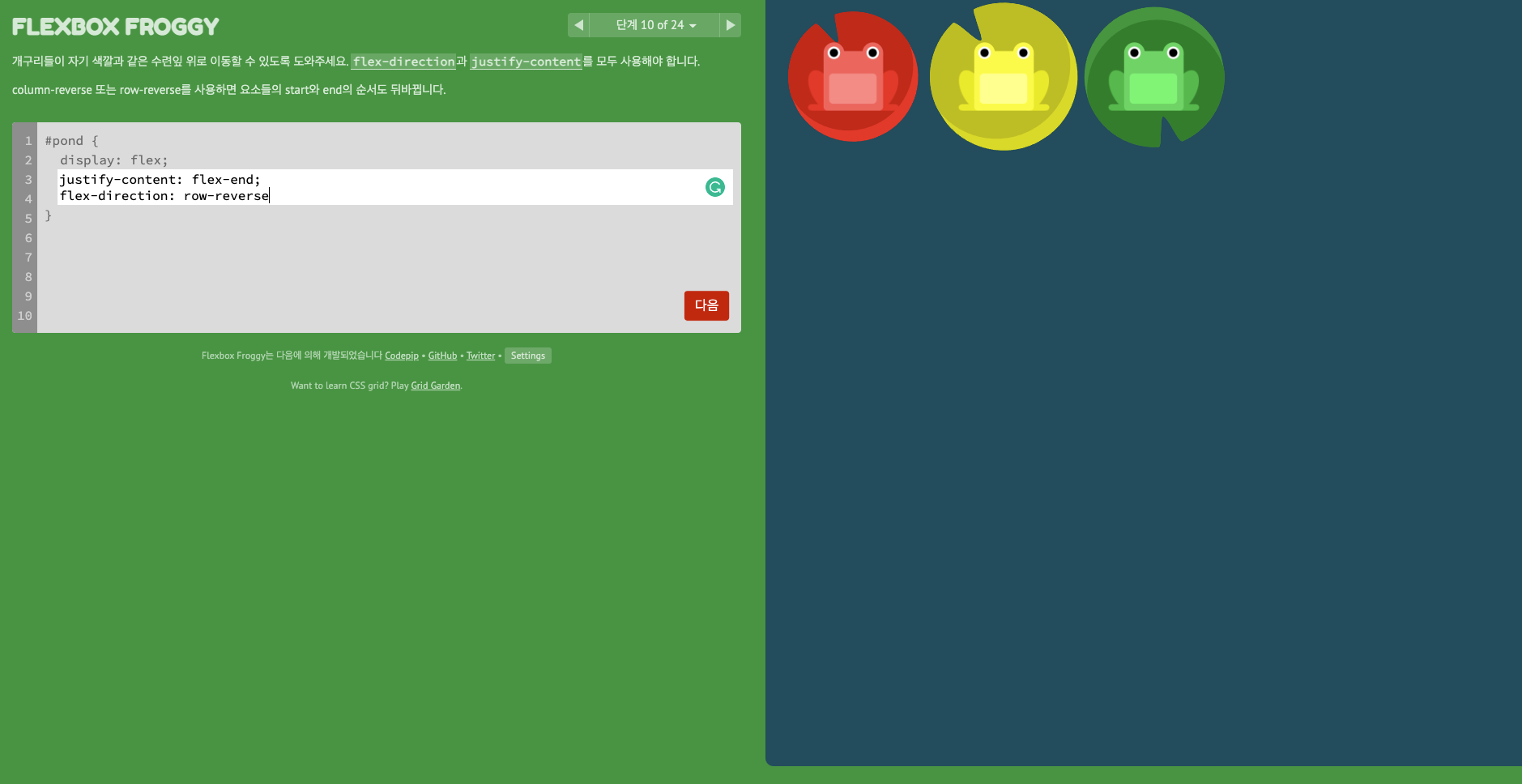 Flexbox Froggy는 Flexbox를 써서 개구리를 옮겨, 연잎 위에 올려야하는 게임이다. 24문제고, 다음 문제로 갈수록 난이도가 올라간다.