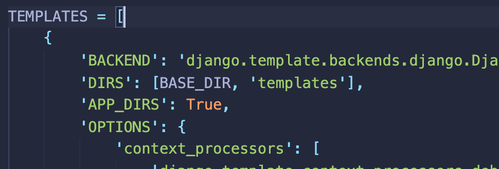 3. templates 폴더가 manage.py와 같은 경로에 있을 때는 settings.py에 TEMPLATES의 'DIRS' 부분에 아래와 같이 추가해줘야 합니다.