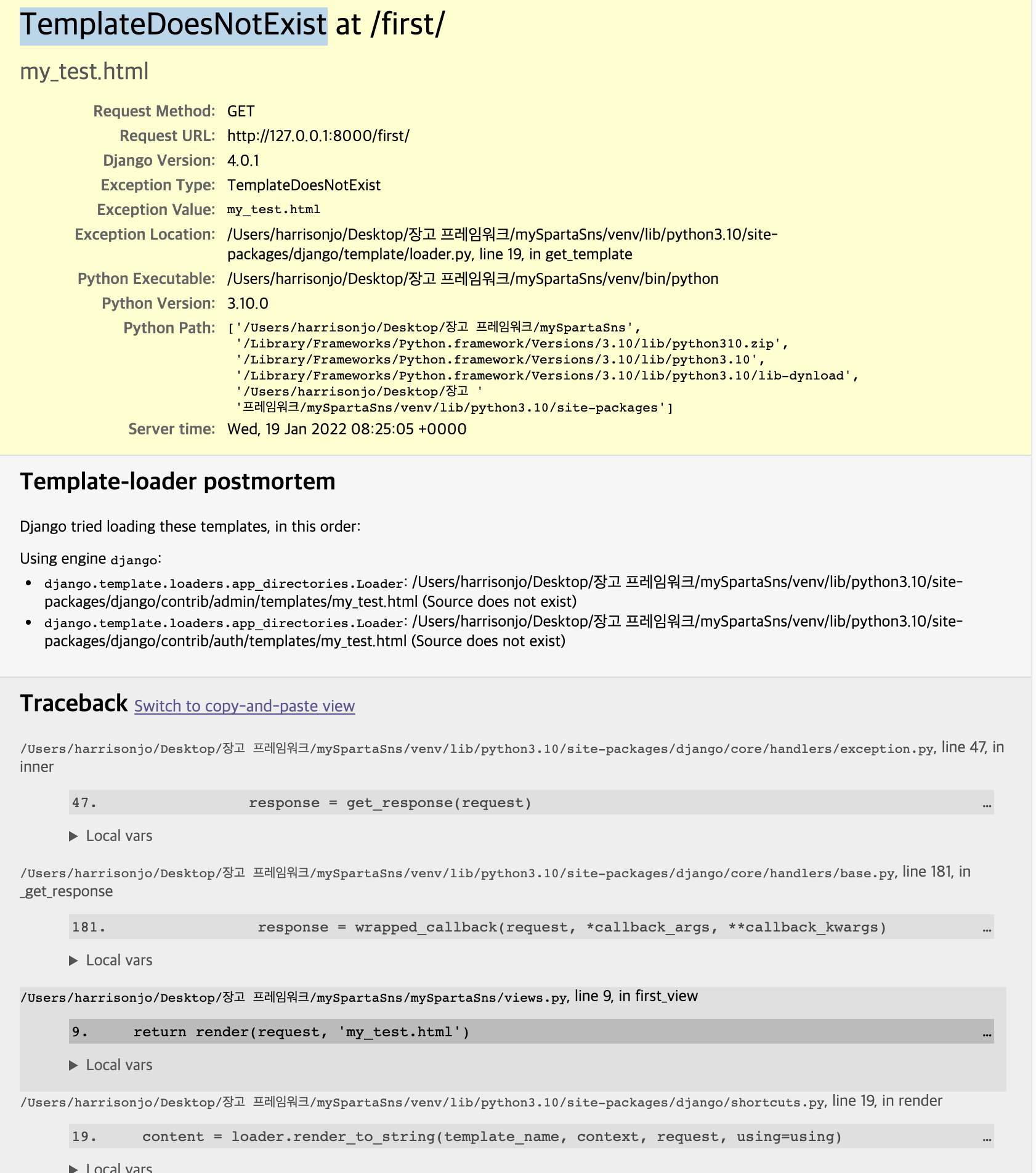 무튼 아래와 같이 TemplateDoesNotExist 에러가 떴다.